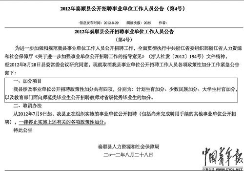 该考生说,2012年7月20日,泰顺县人力资源和社会保障局在泰顺人事人才网发布了“2012年泰顺县公开招聘事业单位工作人员公告(第1号)”,该公告的附件5明确规定事业单位招考加分人员主要分为三类:计划生育加分、少数民族加分和大学生村官加分。