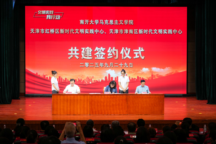 市委宣传部、市文明办、市教育工委、南开大学及红桥区、津南区领导共同启动共建工作。南开大学马克思主义学院负责人分别与红桥区、津南区委宣传部负责人签署共建合作协议,并授予两区“实践教学基地”铭牌。本次仪式标志着共建工作正式启动,拉开了天津市高校马院与文明实践中心共建行动的序幕。