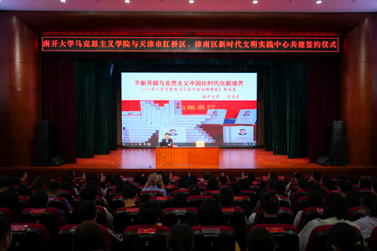当天,南开大学马克思主义学院党委副书记、教授、博士生导师肖光文围绕学习贯彻《习近平谈治国理政》第五卷,面向师生代表、基层宣讲员和群众代表作专题辅导报告。