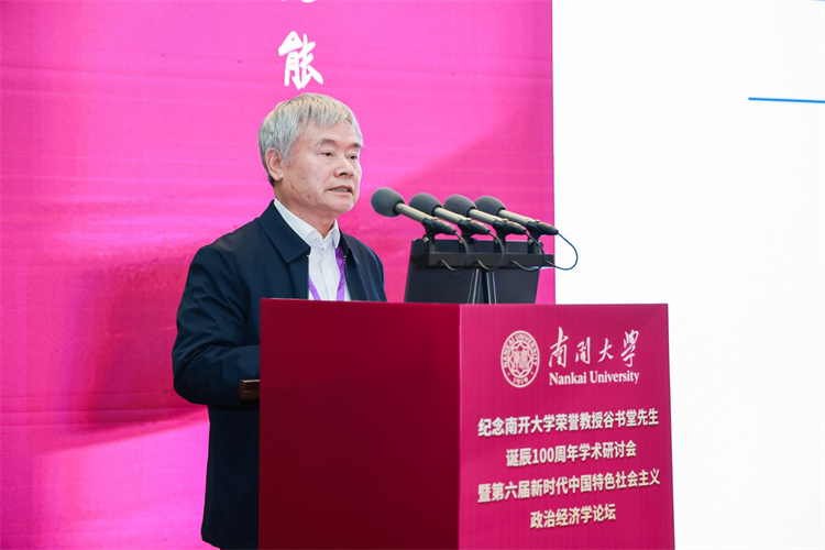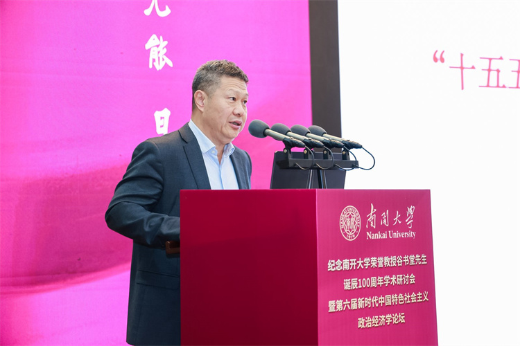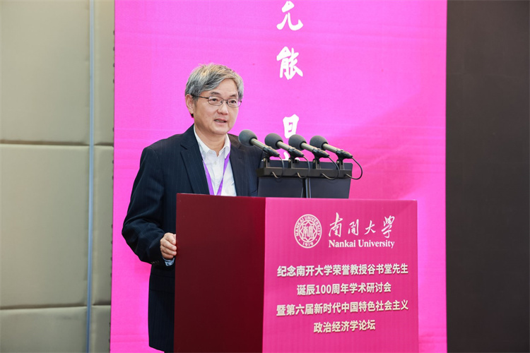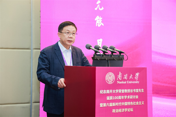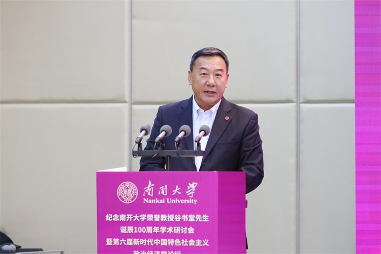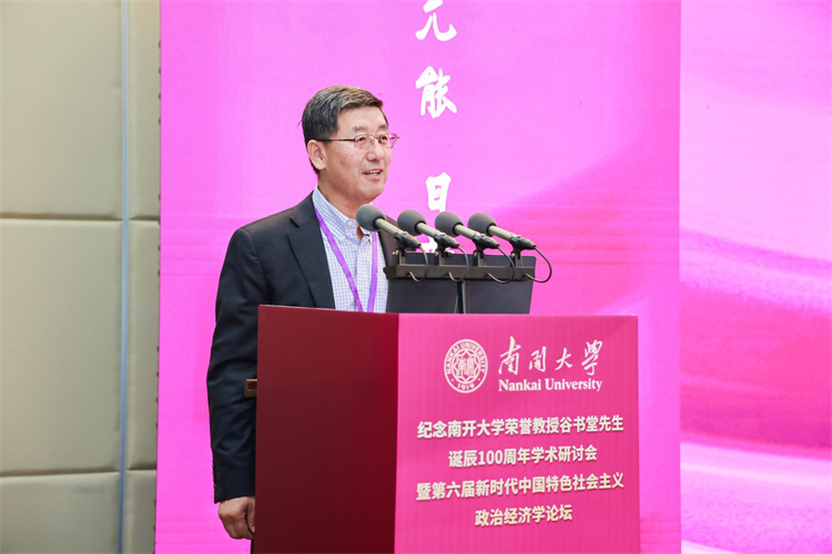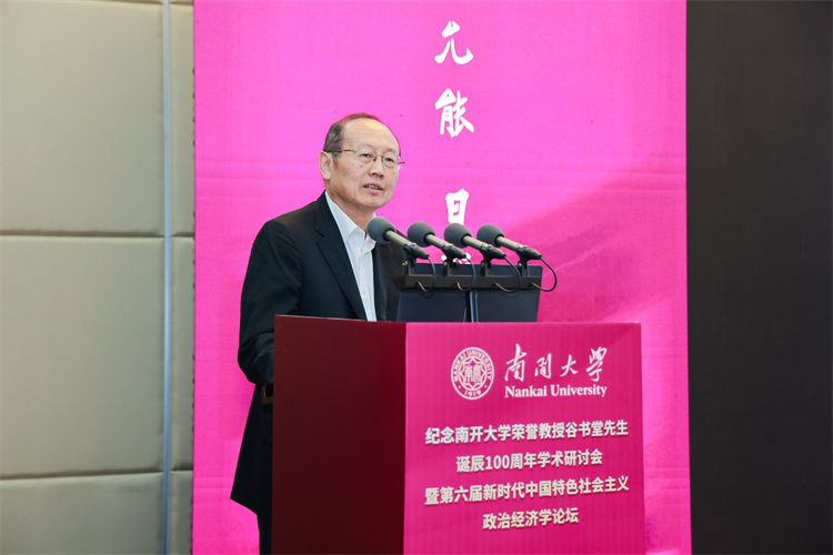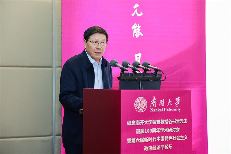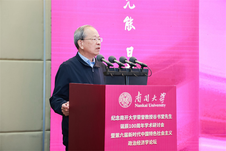 张东刚深情回顾了在南开求学工作的岁月,以及谷书堂先生昔日亲切指导的记忆。他强调,缅怀谷书堂先生,重在继承其学术精神,携手开拓当代中国马克思主义政治经济学的新境界。他呼吁学界以谷先生为楷模,一是紧扣思想之先,坚持以习近平经济思想为引领,深刻把握其核心要义与实践要求,形成系统化的学说成果;二是紧扣育人之本,将中国经济学自主知识体系融入课程、教材与人才培养全过程,实现知识体系建构与拔尖创新自主培养“两个自主”相互融合、同向同行;三是紧扣实践之要,面向中国式现代化的生动实践,在研究真问题、解决新问题中推进理论创新,把实践经验上升为系统化的经济学说。
