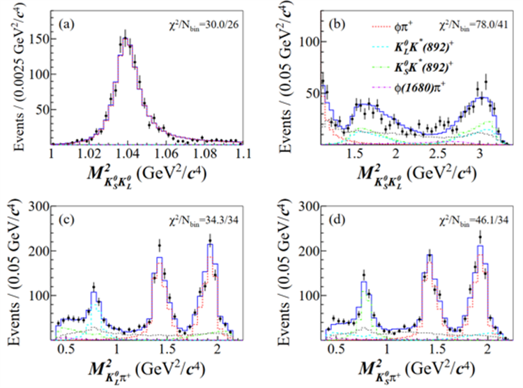 本工作中,团队利用BESIII实验在质心能量 4.128 至 4.226 GeV 之间收集的正反电子湮灭数据,首次对强子衰变过程D_s^+ -> K_S^0 K_L^0 pi^+进行了振幅分析,由此得到R_phi=0.593±0.023(stat)±0.014(syst)± 0.016(phi pi^+),该结果与世界平均值的差异达到3.2倍标准差。本工作的测量结果将对非微扰QCD、强子物质结构以及CP破坏等相关研究的基础输入产生重要影响。下图展示了来自振幅分析的不变质量投影以及R_phi结果的比较。
