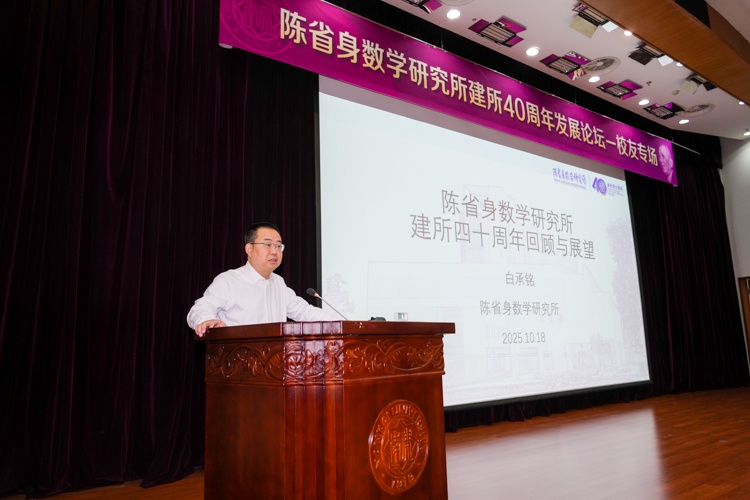白承铭系统回顾了陈省身数学研究所40年以来的发展历程。他从1985年在艰难时期建所讲起,细数了在陈省身先生引领下,研究所“立足南开,面向全国,放眼世界”的初心与实践,列举了研究所在学科建设、人才培养、学术交流等方面取得的丰硕成果。他表示,如今,陈省身数学研究所在陈省身先生的精神感召下,正以“迈向世界一流的国际数学研究机构”为发展目标,共同促进中国数学取得更大发展,早日实现中国数学强国梦。