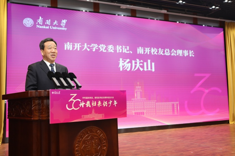 杨庆山代表学校热烈欢迎校友“回家”。他向校友们介绍了学校近年来在教学科研、人才培养、学科建设等方面取得的显著成绩。他说,每一份荣光都闪耀着校友的鼎力支持,欢迎1995届校友常回南开,继续为母校新百年发展建言献策、汇聚力量,与全体南开人一道弘扬“允公允能,日新月异”精神,共绘南开更加辉煌的未来篇章。