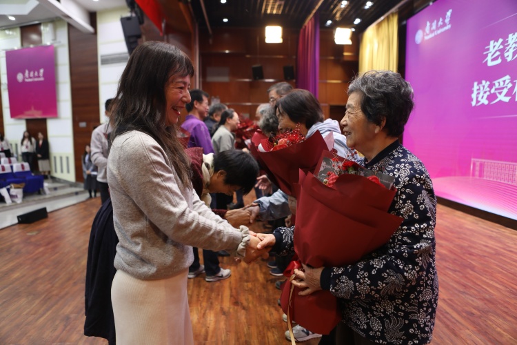 饮水思源,难忘师恩。校友代表上台向老教师代表献花,感恩他们的谆谆教诲和辛勤培养。