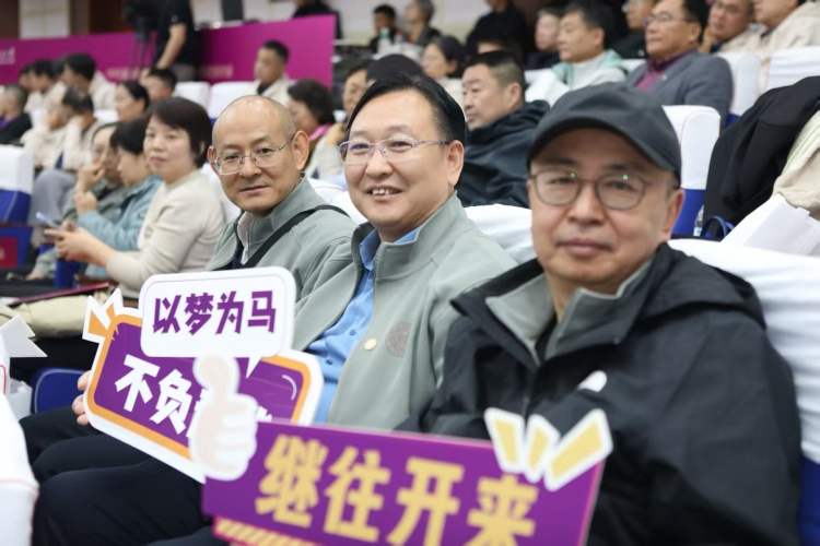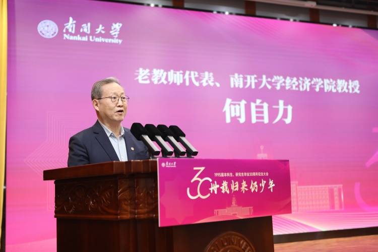 何自力作为老教师代表发言。他回望了过去几十年南开在各领域取得的成就,以及他30年来在学校支持下取得的成果,感慨“在中国式现代化壮丽事业的天空中始终闪耀着绚丽的南开光芒”。他勉励各位校友“继续以爱国之心砥砺报国之行”。