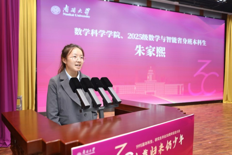 数学科学学院、2025级数学与智能省身班本科生朱家熙作为本科生代表,对学长学姐返校表示热烈欢迎。她感动于南开校园生活鲜活质朴的底色和学长学姐与南开深厚的感情积淀。“赓续百年学脉,携手创造未来。”她代表新一代南开人作出“传承南开精神、书写时代答卷”的承诺。