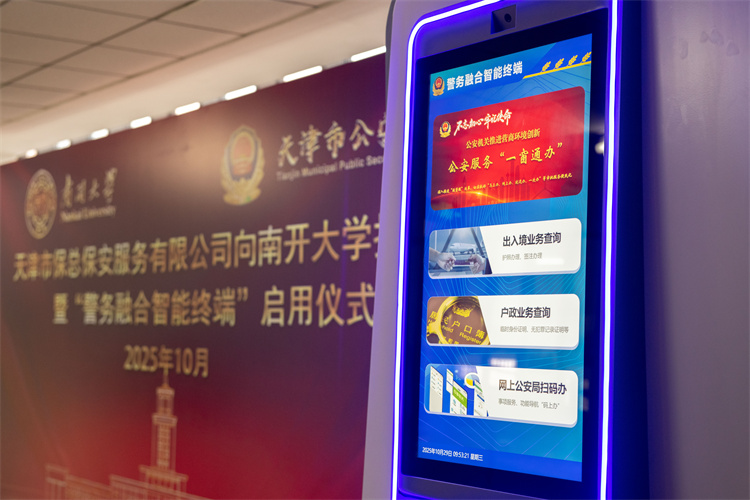 牛文利代表南开大学向天津市保总保安服务有限公司颁发捐赠证书,感谢其对校园安全与便民服务工作的支持。他表示,这台终端体现了“新、实、好”三个方面,一是“新”模式,实现了师生无需走出校园,即可自助办理临时身份证明、无犯罪记录证明等政务事项,达成“少跑腿、好办事”的目标;二是“实”举措,将学校党委“我为群众办实事”的内容转化为看得见、摸得着的民生实效;三是“好”机制,学校党委将以该终端为契机,进一步深化警校协同联动工作机制,将我校平安校园建设提升到新的水平,以高质量安全保障学校高质量发展,服务天津高水平建设。
