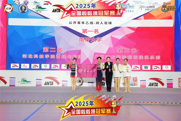 南开新闻网讯(通讯员 阎宝岩)近日,2025年全国啦啦操冠军赛在河北滦州燃情开赛。在啦啦操示范套路项目的角逐中,有着连续三年斩获全国锦标赛示范套路冠军底蕴的南开大学啦啦队获得公开青年乙组-花球校园啦啦操示范套路(2020版)冠军,并斩获公开青年乙组双人花球第一名。