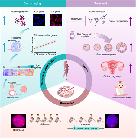 南开新闻网讯(记者 丛敏 通讯员 叶孝颖)近日,南开大学生命科学学院、药物化学生物学全国重点实验室发育生物学及干细胞团队的一项开创性研究,为因年龄或不明原因导致不孕的女性带来了新希望。研究深入揭示了女性在34岁后生育能力下降背后的年龄分子时钟——核糖体失调,并初步验证了药物雷帕霉素可作为一种潜在的、安全有效的治疗方法,帮助反复体外受精(IVF)失败的患者实现成功妊娠和活产。这表明,雷帕霉素或为不孕治疗带来新突破。
