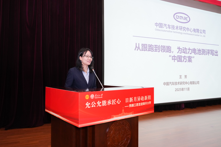 全国劳动模范、中汽研新能源汽车检验中心(天津)有限公司总工程师王芳以“从跟跑到领跑,为动力电池测评写出‘中国方案’”为题,讲述了中国车载电池行业人通过辛勤坚守和不懈付出,探索出一条动力电池测评和标准化技术的中国道路,并最终将中国标准推向世界的动人故事。她说,“越是基础的工作,越需要沉得下心、稳得住劲、守得住分寸。”