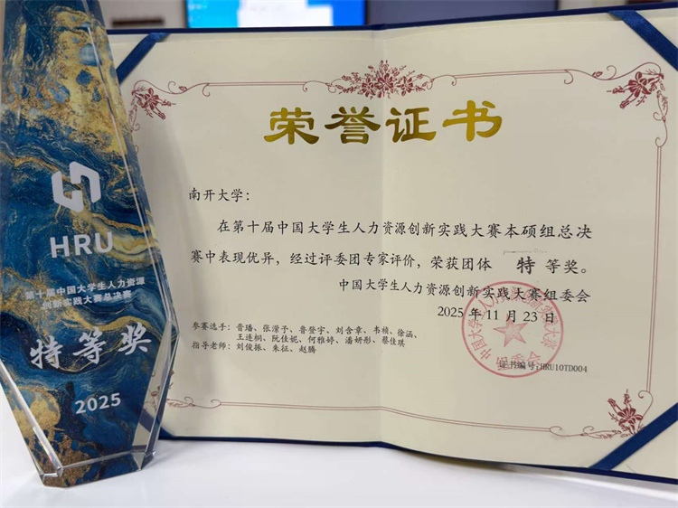 南开大学商学院人力资源管理系本科生团队由15人组成,在学院教师刘俊振、朱征、赵腾的指导下,充分利用课余时间,参加大赛培训,了解赛事规则,合理分工,积极商讨,完成诸如资料搜集、过滤升华、数据分析、法律熟知、报告撰写,展示演练等环节,并在地区赛、全国总决赛的各个赛道充分展现专业技能、理论功底、卓越素质和南开风采,博得由企业高管、资深HR、律师、仲裁委人士等构成的专业评委团的高度认可和盛赞,并最终取得团体特等奖的最高荣誉。