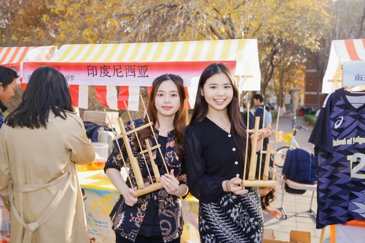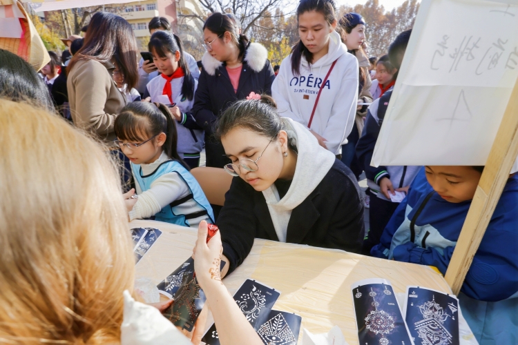 各展区呈现多姿多彩的文化元素,为师生提供了探索世界各地多元文化的宝贵机会。在中国展区,书法、剪纸、古琴等非遗文化体验项目,让中外师生尽情领略中华优秀传统文化的深厚魅力与时代风采;在东南亚展区,中外师生共同尝试演奏印度尼西亚传统乐器昂格隆、试穿越南民族服装奥黛,体验泰国传统游戏“揽链子”和马来西亚传统海娜绘制;在欧洲展区,有趣的意大利桌游Tombola、精致的英国茶叙、可口的法国甜品让人目不暇接,德国拼图与俄罗斯知识问答给现场观众带来一场“头脑风暴”;在澳大利亚展区,“袋鼠障碍接力赛”、TimTam巧克力饼干制作挑战、原始绘画创作等一系列活动,让大家沉浸式感受澳大利亚这片古老大陆的独特心跳与现代活力;在中东、拉美与非洲展区,古老的阿拉伯书法、动感的智利“足球对战”、独具风情的非洲歌舞与特色小吃,展现了多元文化魅力。
