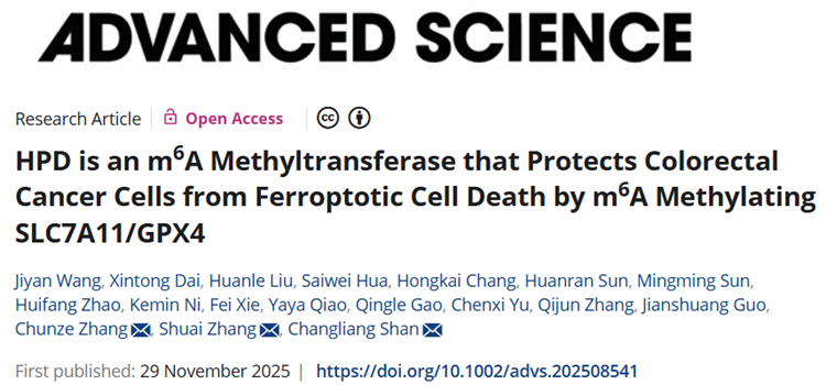 南开大学药学院山长亮课题组于11月29日在Advanced Science杂志上发表了题为《HPD is an m6A Methyltransferase that Protects Colorectal Cancer Cells from Ferroptotic Cell Death by m6A Methylating SLC7A11/GPX4》的研究文章。该研究首次揭示,酪氨酸代谢酶HPD不仅参与代谢过程,还具备独立于已知甲基转移酶METTL3的m6A甲基转移酶活性。值得注意的是,HPD仍以SAM作为甲基供体,并拥有与METTL3相似的催化结构模序。机制研究表明,HPD通过其甲基转移酶活性对铁死亡关键调控基因SLC7A11和GPX4进行甲基化修饰,进而影响它们的蛋白表达水平,最终调节结直肠癌细胞的铁死亡过程及肿瘤进展。总而言之,本研究成功鉴定HPD作为一种新型、不依赖METTL3的m6A甲基转移酶,通过调控SLC7A11和GPX4的表达,影响铁死亡过程,从而在结直肠癌中发挥促肿瘤作用。