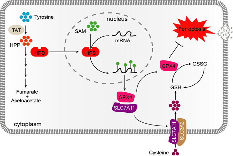 HPD甲基化修饰SLC7A11/GPX4从而调控铁死亡和肿瘤生长示意图