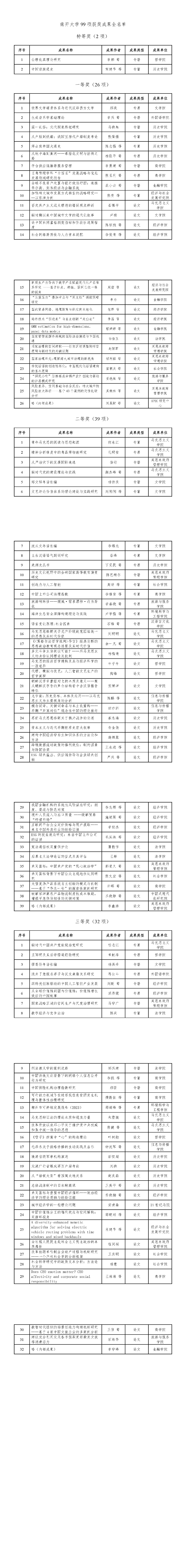 从获奖成果等级看,特等奖2项,一等奖26项,二等奖39项,三等奖32项。从获奖成果类别看,著作类40项,论文类59项。从获奖成果单位看,经济学院15项,历史学院12项,马克思主义学院10项位居前列。