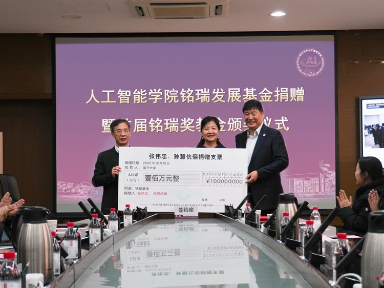 12月10日,“铭瑞发展基金”捐赠仪式及首届铭瑞奖教金颁奖仪式在人工智能学院举行,南开大学副校长方勇纯代表学校接受100万元捐赠,并为张伟忠校友致送南开大学捐赠纪念证书、纪念牌。