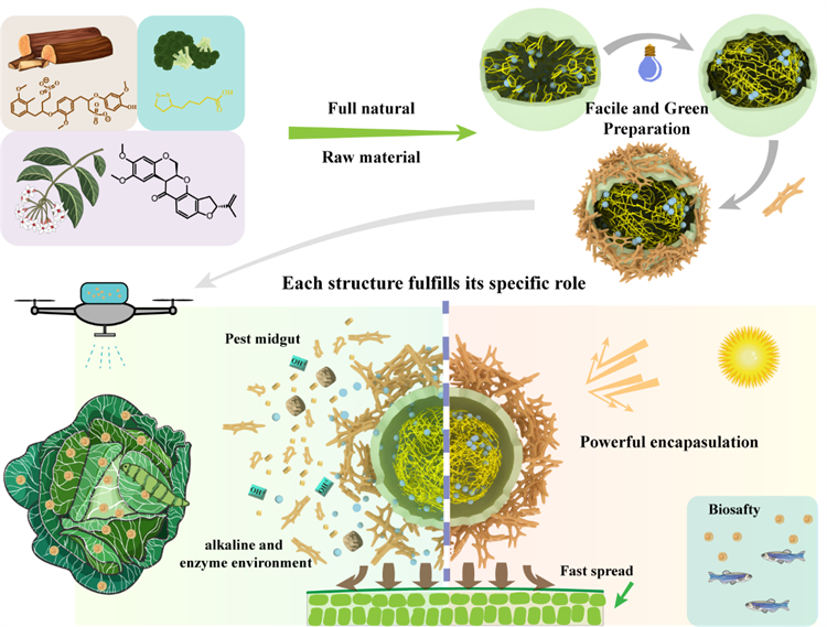 传统农药在保卫粮食安全的同时,也因利用率低、残留高、非靶向毒害等问题,对生态环境构成压力。汪清民团队瞄准这一核心难题,采用光引发交联和自组装结合的制备策略,巧妙利用硫辛酸、木质素两种天然产物,创新性地设计了凝胶-表或中间层-矿化外壳的内中外三层“纳米战甲”。整个过程绿色、高效。这套“战甲”能响应害虫肠道特有的碱性环境或酶信号,实现定时定位的靶向释放,直击要害,减少在作物和环境中的无效残留。同时外甲的丰富化学结构赋予其优异的叶面铺展与持留能力,加上内核的缓释设计,使农药更持久地发挥作用,从源头减少施用量。这一“纳米战甲”还具有突出的环境友好性,因其材料源于天然,制备过程绿色。水生生物毒性试验表明,其对斑马鱼水生生物的毒性比传统乳油制剂降低约49 %,环境安全性显著提高。