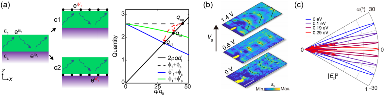石墨烯等离激元具有灵活的电调谐特性,通过模式耦合效应,已被认为是实现 v-HPhPs 调控的重要物理机制。研究团队基于在等离激元领域的长期研究积累[Nat. Commun. 10, 2774 (2019);Nano Lett., 21, 5151 (2021); Nat. Commun., 13, 983 (2022); Phys. Rev. Lett. 134, 043802 (2025)],在理论上建立了石墨烯等离激元极限调控能力的物理模型,并在实验中通过在 v-HPhPs 薄膜/空气界面集成层间偏压双层石墨烯结构,利用层间电荷同相集体振荡的等离激元模式,验证了这一极限化调控。该调控方式具有动态范围大、不依赖介电环境、低驱动电压等优势。基于此,团队演示了极化激元等频色散线拓扑相变的灵活调控。更重要的是,该工作展示了对片上光场能流方向的动态编程能力,为中红外片上动态功能器件的发展开辟了新前景,在可重构热管理和超灵敏生物传感等领域具有重要应用潜力。