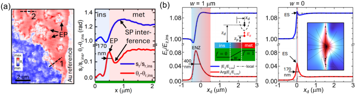 镍酸盐材料作为典型的强关联氧化物体系,晶格、电荷与自旋等参数交织,展现出复杂而丰富的物理行为,并可在温度、电场等外场激励下发生一阶金属-绝缘体相变。罗维维副教授与其博士后期间所在的日内瓦大学 Alexey B. Kuzmenko 教授团队合作,以镍酸钕(NdNiO₃)薄膜为研究对象,利用中红外散射型近场光学显微技术,实现了金属-绝缘体相分离边界的纳米级成像,并在界面处观测到显著增强的近场光学相位信号。结合理论分析与数值模拟,研究揭示了实验信号源于金属–绝缘体边界处形成的边缘等离激元模式。随着相变边界宽度的减小,该模式由介电常数近零下的局域响应,逐渐演变为具有准一维传输特征的非局域响应。该工作阐明了非局域响应在强关联体系近场光学表征中的关键作用,为金属–绝缘体相变行为的实验识别与理解提供了重要判据。同时,准一维传播的边缘等离激元模式的发现,为发展基于相变材料的可重构红外光子器件提供了重要物理基础。