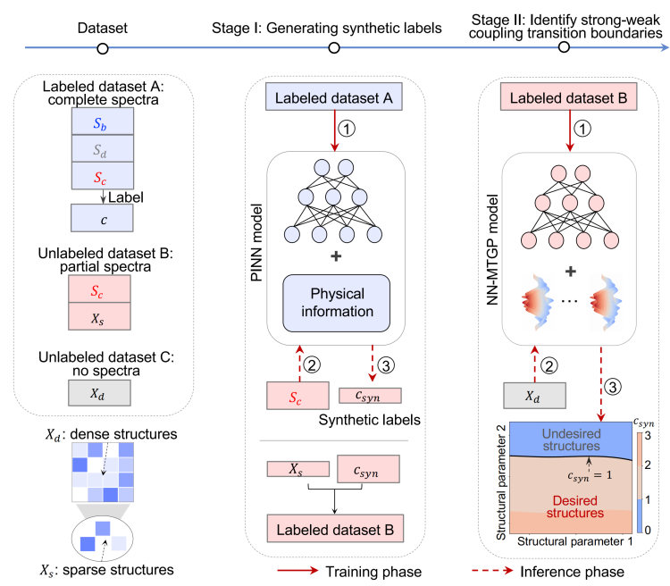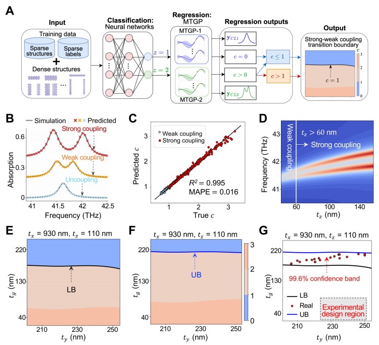 光子体系通过对光与物质相互作用的精确调控,已在分子传感、光电器件构建以及极端化学反应的实时调控等领域得到广泛应用。然而,传统微腔或波导中的光与物质耦合强度普遍较弱,难以显著改变体系的宏观光学响应特性。近年来,强耦合光子系统因其能够将光-物相互作用的强度提升数个量级而备受关注,在超灵敏分子检测、高带宽光调制器以及极化激元化学等前沿研究方向展现出颠覆性潜力。实现高效构建强耦合光子器件的关键问题在于,如何在结构参数空间中精准定位“弱耦合”与“强耦合”的临界边界。传统统计方法和常规机器学习模型难以有效解决上述复杂问题,因此亟需开发一种更加高效、精准的设计方法,以突破现有技术瓶颈。