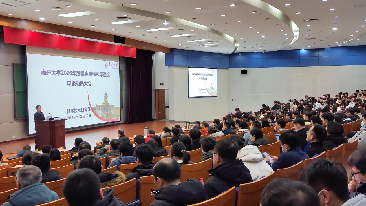 南开新闻网讯(通讯员 宁洁 张博)为深入贯彻落实党中央、国务院关于基础研究的战略部署,准确把握科学基金深化改革总体要求,凝聚全校共识、锚定发展目标、汇聚协同合力,南开大学于12月30日在省身楼报告厅召开2026年度国家自然科学基金申报动员大会。副校长方勇纯出席会议并作动员讲话。各二级单位分管科研工作的负责人及科研干事、师生代表、附属医院科研人员约400人现场参会。