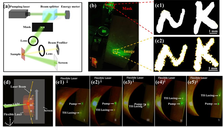 在研究过程中,研究人员首先通过选用两种不同厚度的Mylar膜与PCLC薄膜堆叠形成打破空间反演对称性的一维二元光学超晶格结构,引入耦合系数调制构建合成参数空间,类比二维六角晶格中的量子谷霍尔效应,阐明异位点势的AB与BA超晶格拓扑性质的差异。进而将具有不同拓扑性质的一维等耦合异位点势的AB与BA超晶格拼接,产生了拓扑保护的界面态。这一界面态在能带隙中高度局域化,且对结构无序具有一定鲁棒性,为激光振荡提供了理想的光学腔模式。实验上,团队通过旋涂增益染料PM597于PCLC薄膜表面,制备出具有17层薄膜的柔性激光器件。在532 nm脉冲激光泵浦下,该器件在575.4 nm波长处实现了左旋圆偏振的拓扑激光输出,阈值低至0.47 μJ (1.5 MW∙cm-2),斜率效率达4.0%。激光光束具有良好的方向性,且其空间分布与泵浦光斑形状高度一致,显示出其在图像传输与显示方面的应用潜力。进一步,研究人员固定泵浦激光方向,将薄膜弯曲并自下而上移动,使泵浦光分别照射到样品的五个不同区域(Ⅰ-Ⅴ),出射激光也会随之在光屏上自下而上移动。调节VCSEL薄膜的曲率半径可以进一步控制光束的转向度。这一特性意味着拓扑VCSEL可以在不旋转激光器件的情况下在多个角度出射激光。值得注意的是,拓扑VCSEL是热稳定的,即使经过很长一段时间的泵浦,也能保持其原始的激光性能。这些特性可以使其与众多可穿戴光子器件集成,实现可穿戴显示,电子防伪、激光扫描等应用。