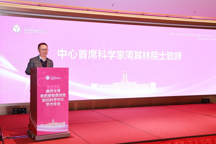 周其林介绍了南开大学有机新物质创造前沿科学中心的基本情况。他表示,中心的核心任务是通过学科交叉融合推进新物质创造发展。本次会议旨在为中心成果展示与学术交流提供良好平台,期望各位专家学者能为中心的战略路线、未来方向提出指导意见,为中心高质量发展注入智慧力量。