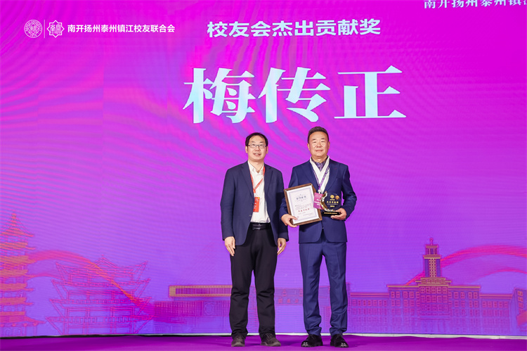 会议设置了年度表彰环节,牛文利为梅传正颁发南开扬州泰州镇江校友联合会杰出贡献奖。