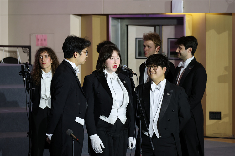 演出以南开大学学生合唱团有表演民谣合唱《盛世梨园情》开场。锣鼓声起,常任指挥孟超美教授以刀马旦装扮飒爽亮相,合唱团成员扮相灵动,和声悠扬。一方舞台上,生旦净丑各展风姿,唱念做打皆具神韵,梨园雅韵与现代合唱交织融合,赢得观众阵阵热烈掌声,让正在候场的耶鲁大学Whiffenpoofs合唱团由衷赞叹。