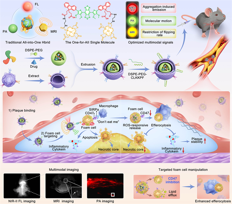 研究团队开发了一种新型的有机分子探针,可同时实现高亮度近红外二区荧光、光声及磁共振成像,通过连接Gd-DOTA配体可以增强荧光信号强度并促进光声转化,同时抑制自由翻转可以增强磁共振成像信号,实现三种成像信号的同步增强。利用三种成像模式优势互补的特点可以提供关于斑块位置、深度和形态的跨尺度信息。进一步制备了分级靶向的递送体系,将多模态成像与选择性泡沫细胞干预相结合,以改善动脉粥样硬化的管理效能。为实现靶向治疗,将分子探针与阿托伐他汀药物共负载响应性载体中,载体表面伪装巨噬细胞膜并修饰泡沫细胞靶向肽。这一分级靶向策略能够精准靶向炎性斑块及泡沫细胞,实现药物的可控释放,从而促进脂质外排、减轻炎症信号,并在动脉粥样硬化动物模型中增强斑块稳定性,并且在治疗过程中还可以实现原位实时监测。该成像引导的整合治疗体系为心血管疾病的精准诊疗提供了广阔前景。