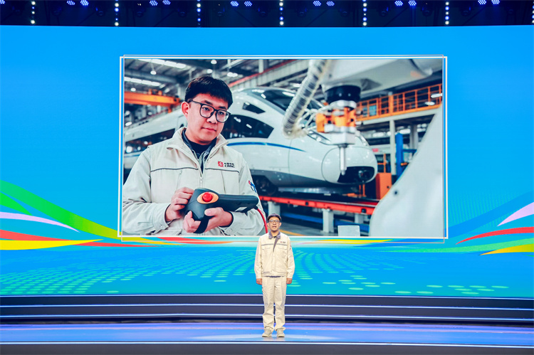 首届大赛就业赛道职教组金奖获得者孙畅已经成为中车唐山机车车辆有限公司一线工人。舞台上,沈阳飞机工业集团首席技师、大国工匠方文墨为他送上了一份特殊礼物——一块他亲手打磨的、能达到“四不透”标准的小铁块。