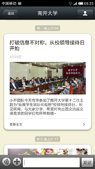 南开新闻网讯(通讯员 辛文忠)4月29日晚11点,距离南开大学第十二次“校领导接待日”活动结束刚刚过去6个小时。一条题为“打破信息不对称,从校领导接待日开始”的微信出现在南开大学官方微信平台里。原本即将就寝的文学院大二学生小常第一时间在手机上阅读了这条1000余字的信息并与室友分享。