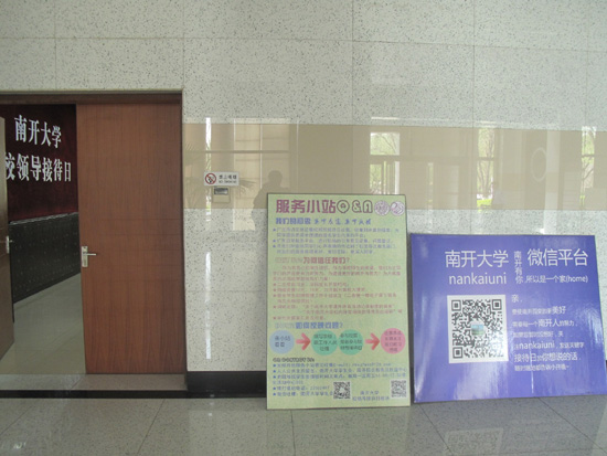 在此次接待日的前一个月,学校在学校食堂等人流量较大的地方设置服务小站,按照类别广泛收集同学们的意见,服务小站还专门立了一块南开大学官方微信的展板。方便同学随时发送提案。