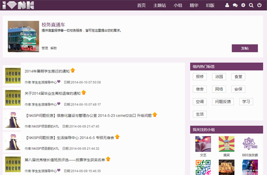 自2012年5月27日新版“我爱南开BBS”推出以来,校务直通车一直是BBS重点建设的小组。借鉴新浪微博等社会网站技术,BBS为学生生活指导中心、信息化建设与管理办公室、图书馆等15个校内部门开通了“官方认证”账号,方便师生直接与学校各个部门进行交流。此外,由学生团队NKISP小组承担BBS校务直通车小组的管理维护工作,定期将校务信息收集整理,反馈到对应的学校部门,及时在BBS上发布校务问题的相关信息和解决方案,搭建起校内师生与学校部门之间的沟通桥梁。