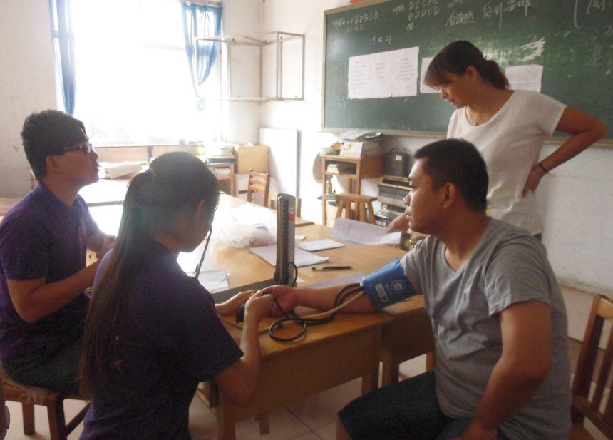 实践团成员运用所学医学知识,为全校180余名教师体检,开展测量血压等医疗服务,向老师们发放了亲自制作的包括教师职业病预防方法和基本治疗原则的健康手册,并在现场进行了有关中学教师亚健康状态的问卷调查。