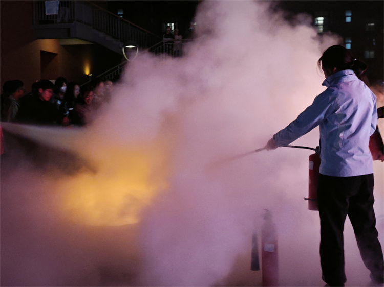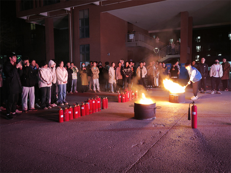 消防演练在“断电”的指令中开始,学生们在宿舍值班员、疏散员的组织下,就近从各宿舍楼应急出口有序撤离,疏散到相对空旷的地段进行模拟避险,并接受灭火器使用培训及室内外消火栓实操演练。