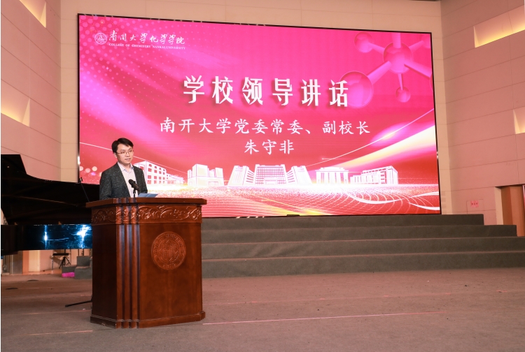 朱守非为盛典致辞,他首先对获奖同学表示祝贺,充分肯定了过去一年化学学子取得的成绩,勉励大家汲取榜样的力量,以身作则,严格要求,传承南开精神,坚定前行方向。他希望同学们要志存高远,追求卓越,忘我奋斗,永不懈怠,胸怀“国之大者”,服务国之所需,把自身的理想同祖国的前途、把自己的人生同民族的命运紧密联系在一起,成长为具有社会责任感、家国情怀、创新意识和实践能力的一流化学人才,堪当起未来民族复兴重任,为全面推进中国式现代化作出南开人新的贡献。