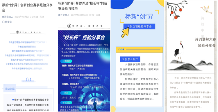 三是搭建资源共享平台,拓展职业发展新路径。在平台建设方面,项目联合创新创业发展指导中心,打造“标新‘创’异”线上线下双结合的经验云分享平台,聚焦创新创业赛事如“挑战杯”“创青春”等,围绕选题定位、商业计划书撰写、项目竞争力提升、心态调整等关键环节,邀请校内双创指导教师、专业导师、项目负责人及优秀校友创业者开展交流培训。通过专业录播与智能剪辑技术,将优质讲座转化为可检索、可回放的在线课程资源,实现跨年级经验传承与资源共享。此外,项目还积极拓展职业发展服务功能,联合文学院职业发展指导中心,策划开展简历与生涯规划报告撰写分享会暨主题党日活动,帮助同学们明晰职业方向、提升求职能力。