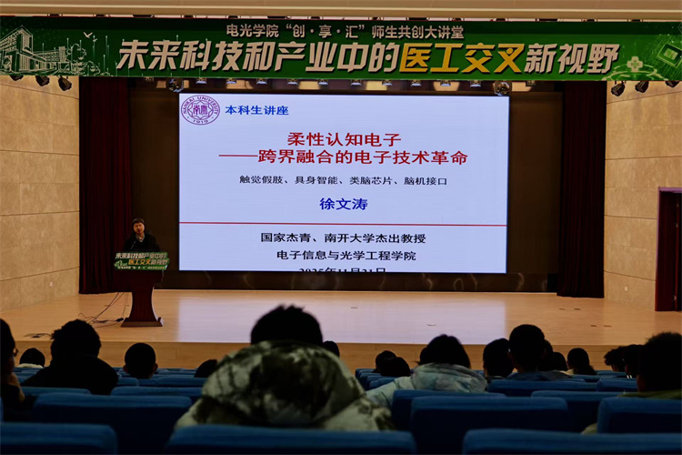 南开新闻网讯(通讯员 田敬伟 贾音 董悦)为服务学校新文科、新工科、新医科“三新”建设布局,引导学生面向国家战略与人民健康需求,深化对医工交叉领域的认知,11月21日,电光学院“创·享·汇”师生共创大讲堂之“未来科技和产业中的医工交叉新视野”主题讲座正式开讲。本次讲座特邀国家杰出青年科学基金获得者、南开大学杰出教授徐文涛担任主讲嘉宾。