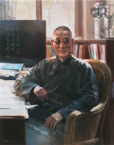 崔明非表达了对于天津画院和南开大学的感谢,并分享了自己的创作感悟。他说,油画《爱国三问》的创作以天津画院纪念中国人民抗日战争暨世界反法西斯战争胜利80周年展览活动为契机,以“深入实际历史、画有厚重感的人物”为指导思想,运用影视工作的算力模型让张伯苓先生的老照片更加清晰,对于画面背景、人物着装与动作进行更加科学的论证。他表示,自己的父亲毕业于南开中学,正是这段南开情缘唤起了他尘封的记忆,促使他对南开精神和张伯苓先生开展更深入的研究。