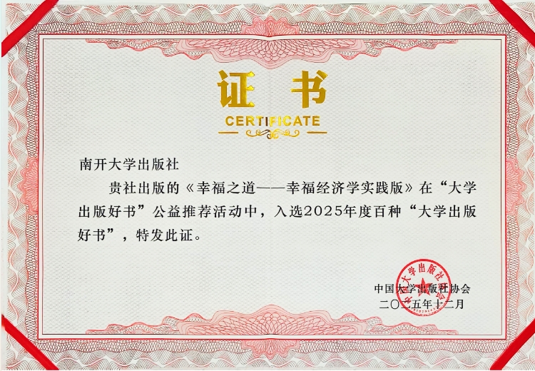 南开新闻网讯(通讯员 周敏 郭俊汝)12月13日,“中国大学出版社协会2025年年会”在浙江杭州举办。会上,2025年度百种“大学出版好书”公益推荐书目发布,由南开大学出版社出版的《幸福之道——幸福经济学实践版》(倪志良、赵春玲 著)入选。