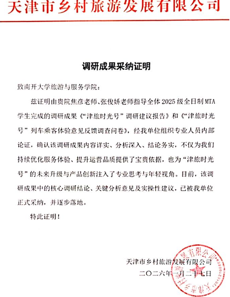 南开新闻网讯(通讯员 陈思雯 焦彦)近日,南开大学旅游与服务学院收到天津旅游集团乡村旅游发展有限公司发来的感谢函,对学校MTA教育中心师生为全国首列沉浸式主题文旅专列“津旅时光号”提供的专业调研成果表示感谢,并确认相关建议已被正式采纳,运用于该项目的服务优化与产品升级中。