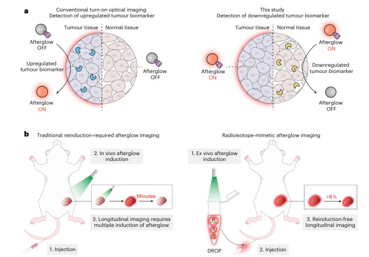 余辉成像展现出比荧光成像更优异的性能,已经被广泛应用于肿瘤检测、器官衰竭早期诊断等临床前研究,但目前报道的余辉探针仅能检测重要疾病上调的生物标志物,且余辉半衰期短,在活体上进行成像时需要反复光照,不仅面临光穿透深度的问题,还让成像流程变得复杂,极大限制了其应用场景,因此开发超长寿命的余辉探针并能实现肿瘤下调生物标志物的检测则尤为重要。