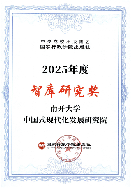 南开新闻网讯(通讯员 孙菲)近日,南开大学中国式现代化发展研究院获得“2025年度智库研究奖”。该奖项由国家行政学院出版社进行评选颁发,旨在表彰兼具理论深度与实践价值的优秀智库研究成果,以及在咨政建言、决策咨询中作出突出贡献的单位与个人。