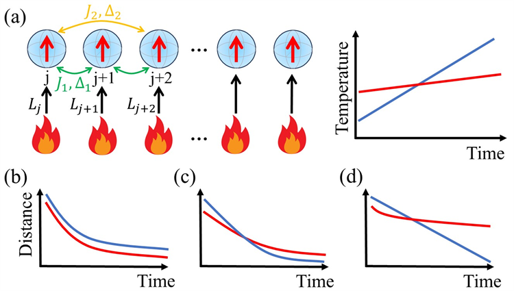 图1:量子姆潘巴效应的示意图。(a) 本文采用的量子耗散自旋链示意图和两种不同初态的升温过程。(b-d) 直观展示的量子姆潘巴效应的基本图像:在动力学演化过程中,尽管某些初始态在初始时刻与稳态之间的“距离”更远,其弛豫轨迹却可能更快地接近稳态,并在演化过程中与其他初始态的弛豫轨迹发生交叉。图中同时示意了弱量子姆潘巴效应(weak Quantum Mpemba Effect, wQME)与强量子姆潘巴效应(strong Quantum Mpemba Effect, sQME)的区别,其中强量子姆潘巴效应表现为对初始条件具有鲁棒性的反常加速弛豫行为。